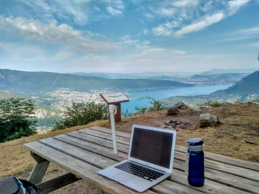 Se trata del monte Montmin, y las vistas son de lo mejor que he visto nunca. Suelo estar en la zona de despegue de ala deltas y parapentes. Hay algunas mesas, en las que si hace un poco de calor, suelo aprovechar para desayunar, comer, cenar y trabajar.