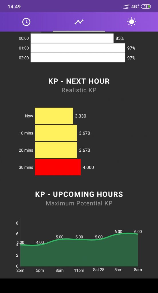 Ella al igual que yo, estaba deseosa de ver auroras boreales. Tenemos un par de aplicaciones en el móvil que nos indican la probabilidad de verlas y la hora aproximada en la que son más visibles. Esto nos hace estar preparados.