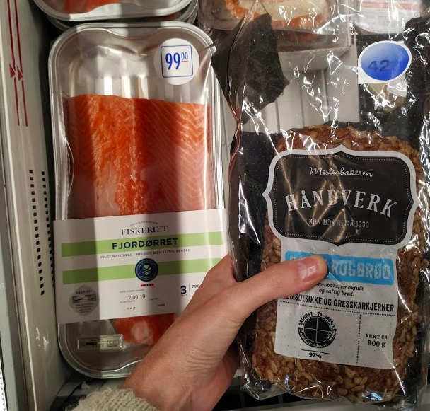 Está claro que Noruega es uno de los países más caros de Europa, pero no me imaginaba que el precio del pan fuese tan alto. En un supermercado he llegado a ver un pan como mi palma de la mano de grande por 4,2€ y al lado 700 gr. de salmón por 9,9€. Así que ahora empujo la comida con salmón en vez de con pan.