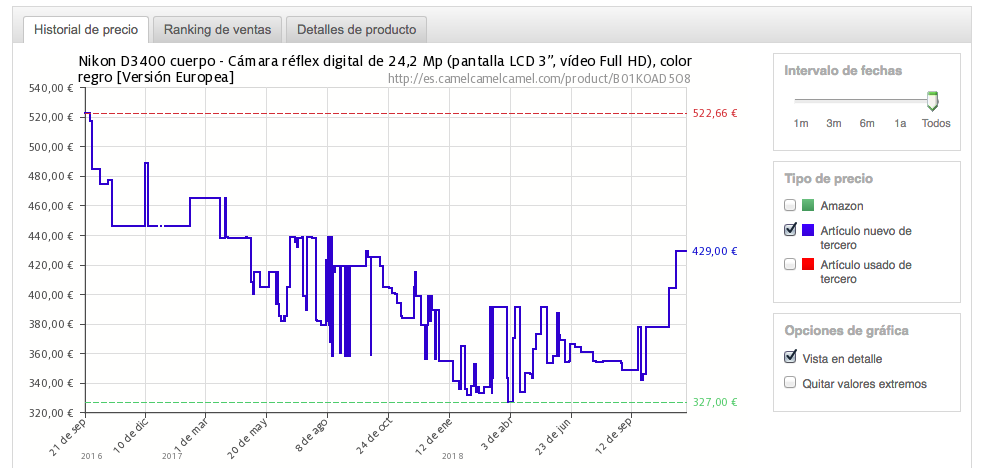 Aquí aparecen los distintos precios de la Nikon d3400 que ha tenido Amazon. Podéis ver que la cámara cuesta ahora 429€ mientras que en Abril de este mismo año costaba 100€ menos.