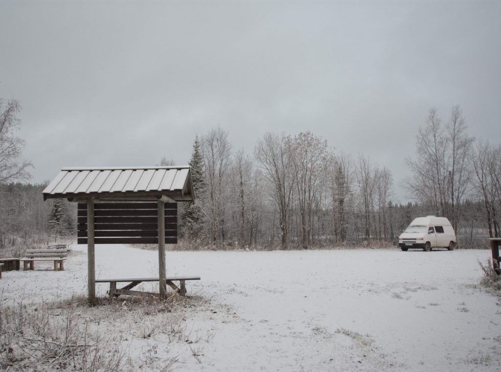 Así me he despertado hoy. Todavía no sé cómo saldré de aquí. Para llegar a este lago conduje durante varios kilómetros por una pista con barro. En ese momento (antes de nevar) no me inspiraba mucha confianza para recorrerla con una furgoneta como la mía y con unos neumáticos como los que calzo. Pero bueno, seguro que con la nieve todo es mucho más fácil (ironía).