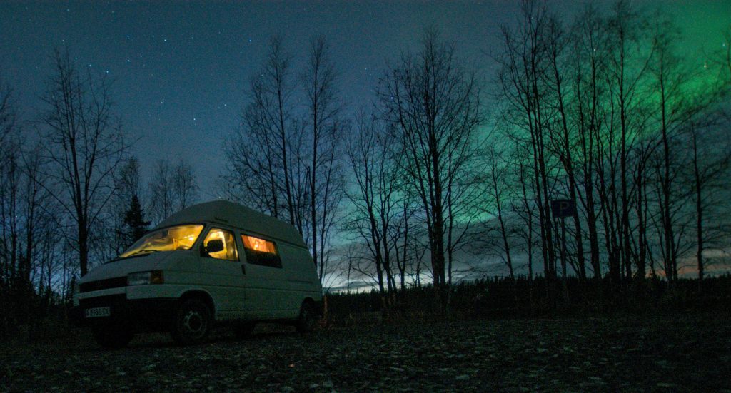 Esta fue la primera foto que hice. Comprobé que esa ligera luz verde, que mis ojos pensaban que era debido al brillo de la luna, no lo era. En seguida el cielo se fue haciendo más verde y esta pareja de alemanes vieron por primera vez Auroras Boreales con sus propios ojos.