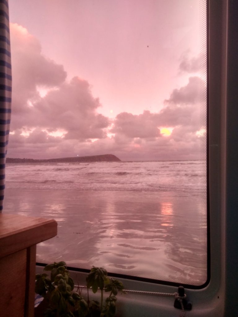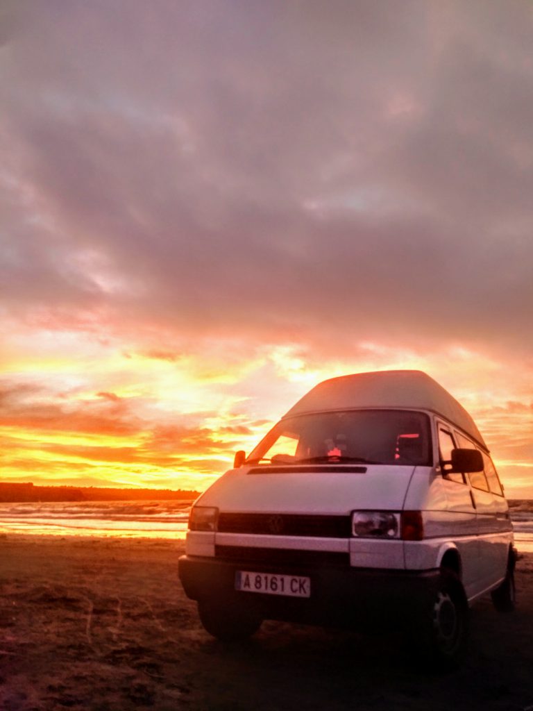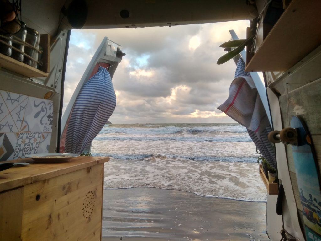 Ahora mismo escribo esto desde la arena. Bueno, la furgoneta esta en la arena, porque hace poco más de diez grados, viento y lluvia.