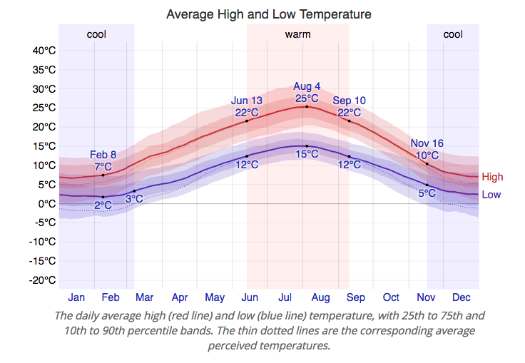 Soy un fan de conocer el pronóstico del tiempo, paso mucho tiempo viendo las temperaturas medias de otros países y ciudades. Si alguien es como yo, le recomiendo la página web weatherspark.com. Puedes ver gráficos como este.