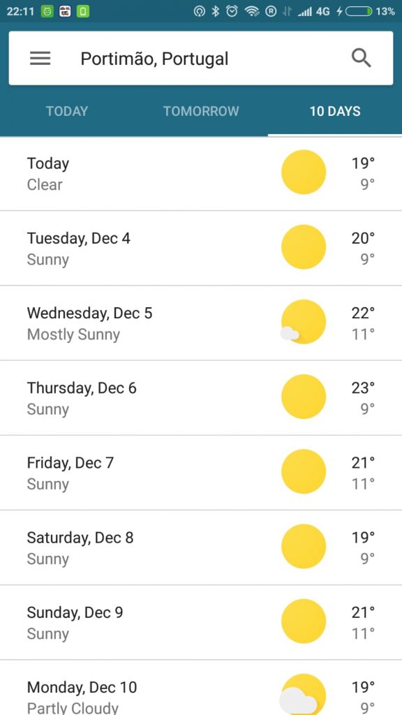 He descubierto que de toda Europa (sin contar las islas Canarias) donde mejor tiempo hace en invierno, es en el sur de Portugal. Así que es un destino bastante probable. El otro día miré el pronóstico en el móvil y decía esto.
