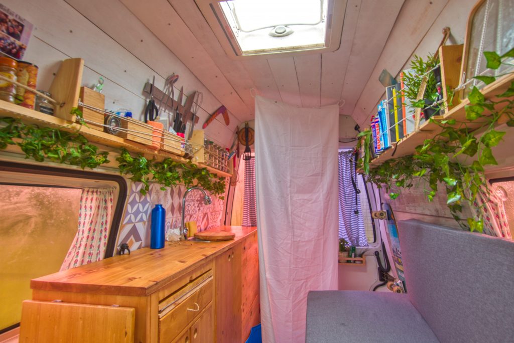 En cambio la solución que tomaron Fede y Anabel, fue ponerla al fondo de la furgoneta, teniendo así una sensación de mayor amplitud dentro de su casa rodante.