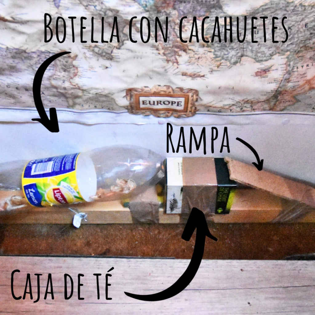 Más o menos por la mitad de la botella, meto unos alambres enganchados a una madera, para que así la botella sea como un balancín. Hago una rampa para que el ratón pueda entrar por el cuello de la botella. La idea es que vaya en búsqueda de los cacahuetes y la mantequilla de maní y se quede dentro.
