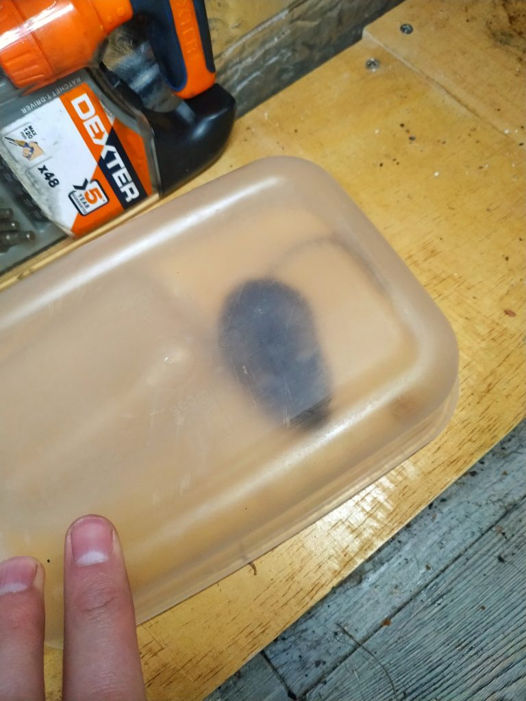 Siguiente puerta, en ese momento el tupper cae, pero no hay nada dentro. Toca abrir el último armario, me froto los ojos ¿Es eso? Veía algo negro dentro de un tupper. ¡Si! El ratón estaba encerrado. Estoy tan cansado que decido poner unos libros encima para que no pueda escapar y me meto de nuevo en la cama.